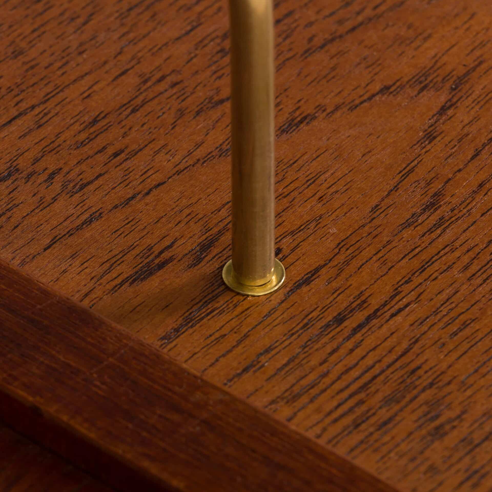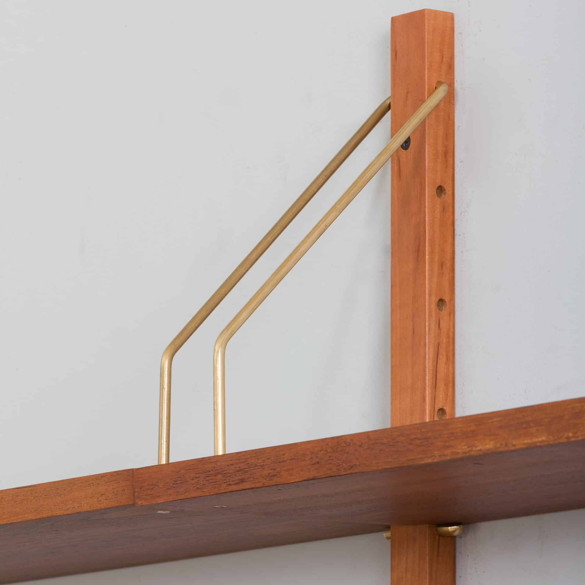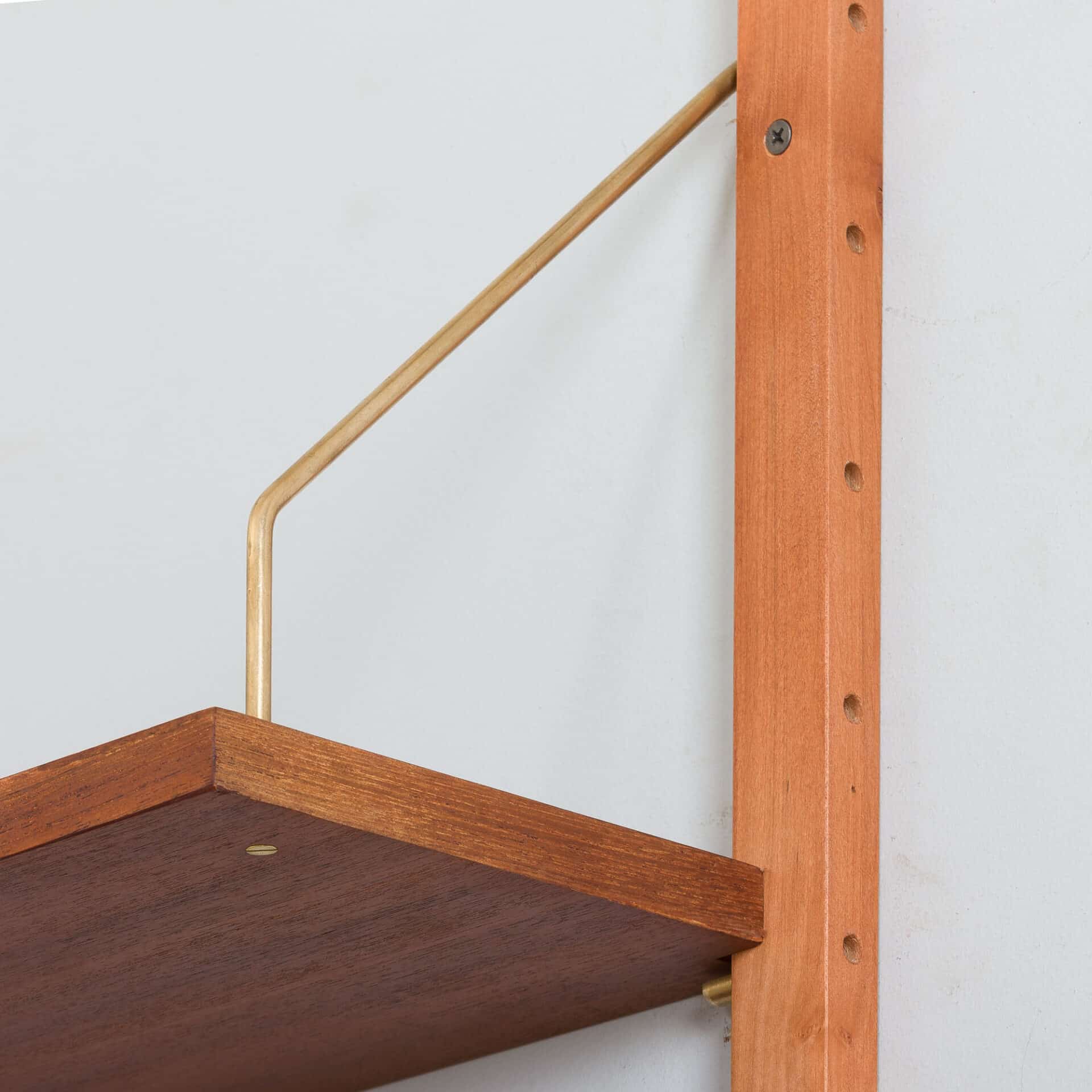 Danish wall unit in the style of Cadovius comes from the 1960s. Manufactured most likely by PS System, Randers. This entirely modular shelving system is ideal for a home office, as the compact desk will allow you to work even in the living room. The whole set is finished in teak veneer. Especially noteworthy is brass finishing of the cabinet handles, uncommon in Cadovius design.