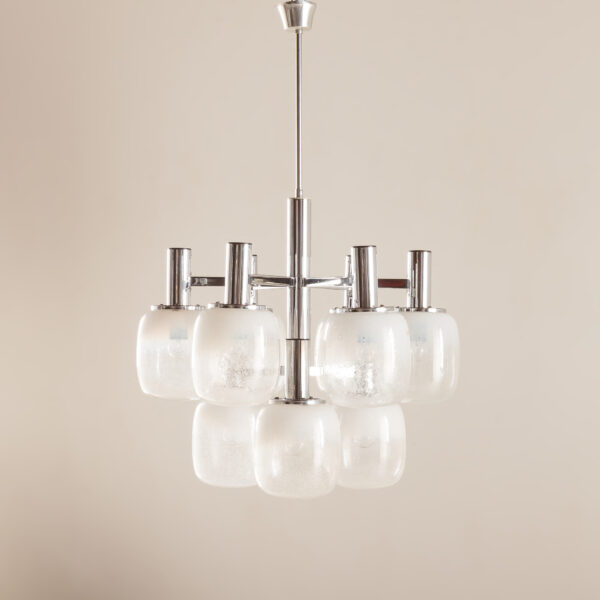 This Murano glass chandelier designed in the Venini style with many glass flowers on a chrome sputnik frame is an extraordinary eye-catching piece. It was designed in the 1970s. It hangs on an 80 cm long chain ended with a chrome-plated canopy. It features a few bulbs that give a fountain of light reflected in the glass.
