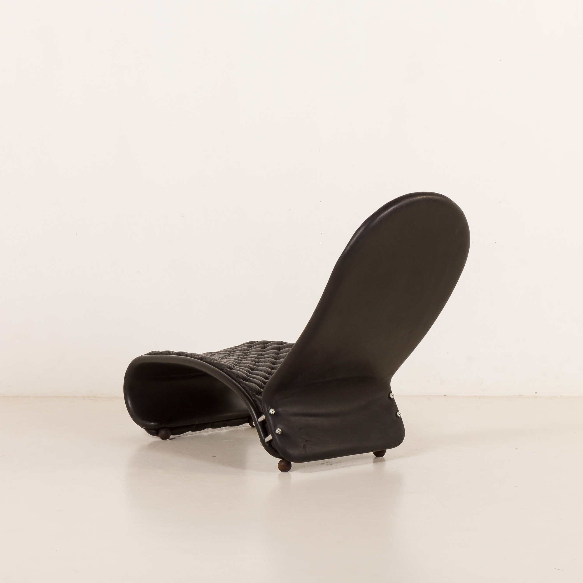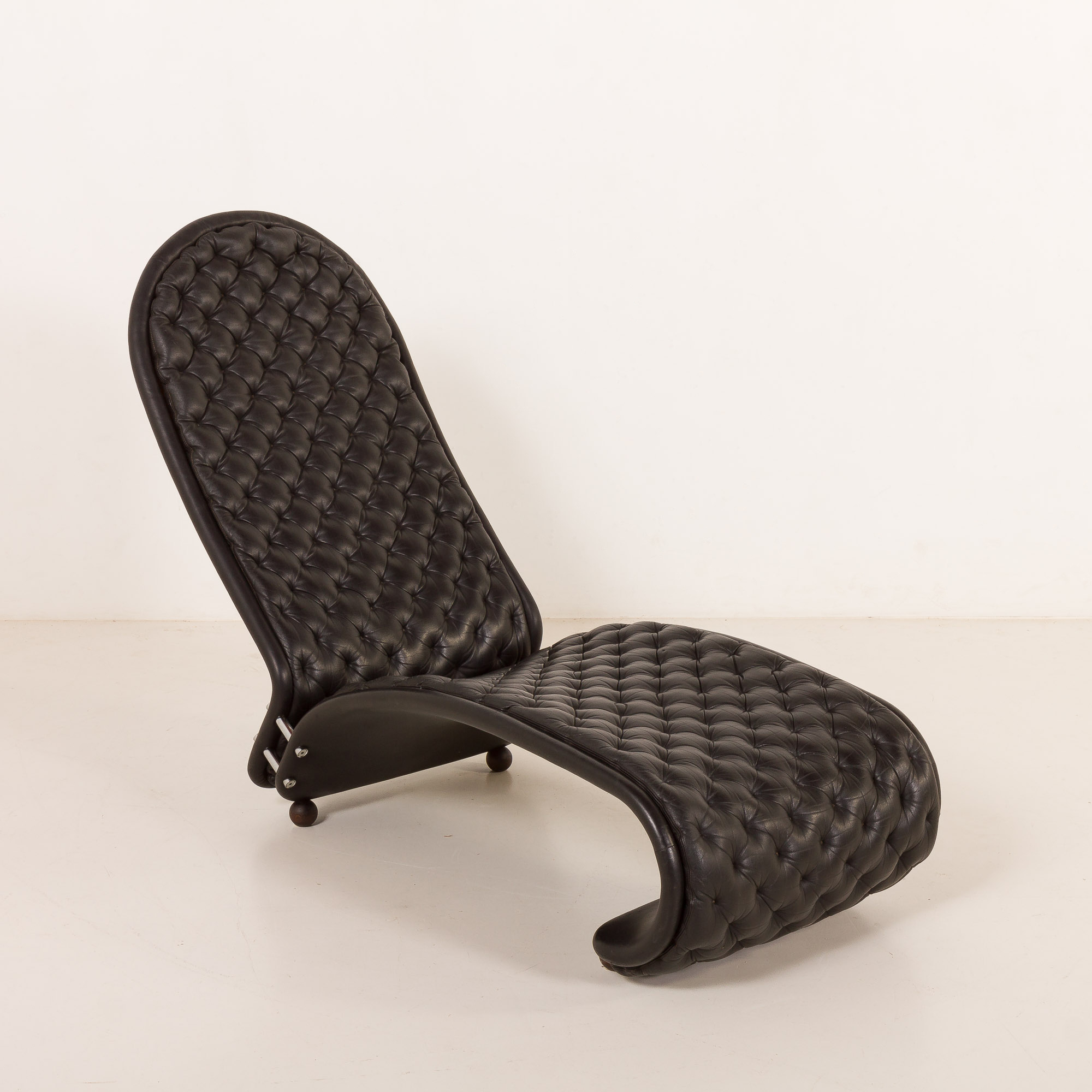 A black leather chaise lounge designed by Danish artwork master Verner Panton for Fritz Hansen, part of the System 1.2.3 collection, debuting in 1974.
