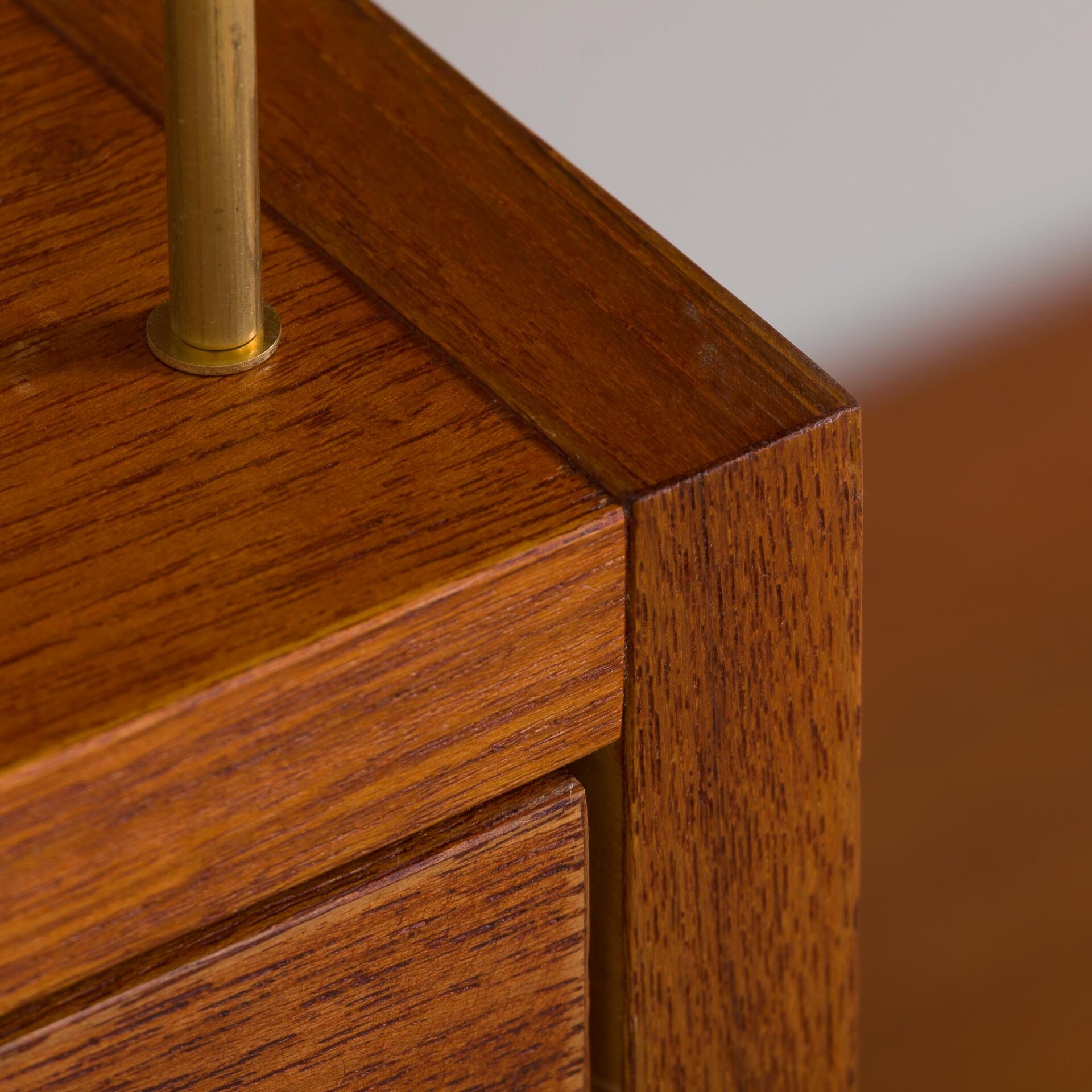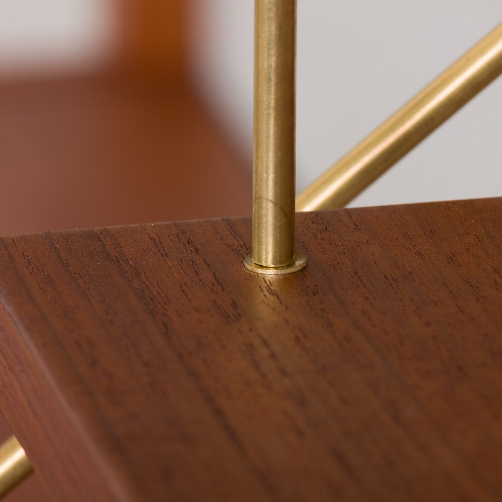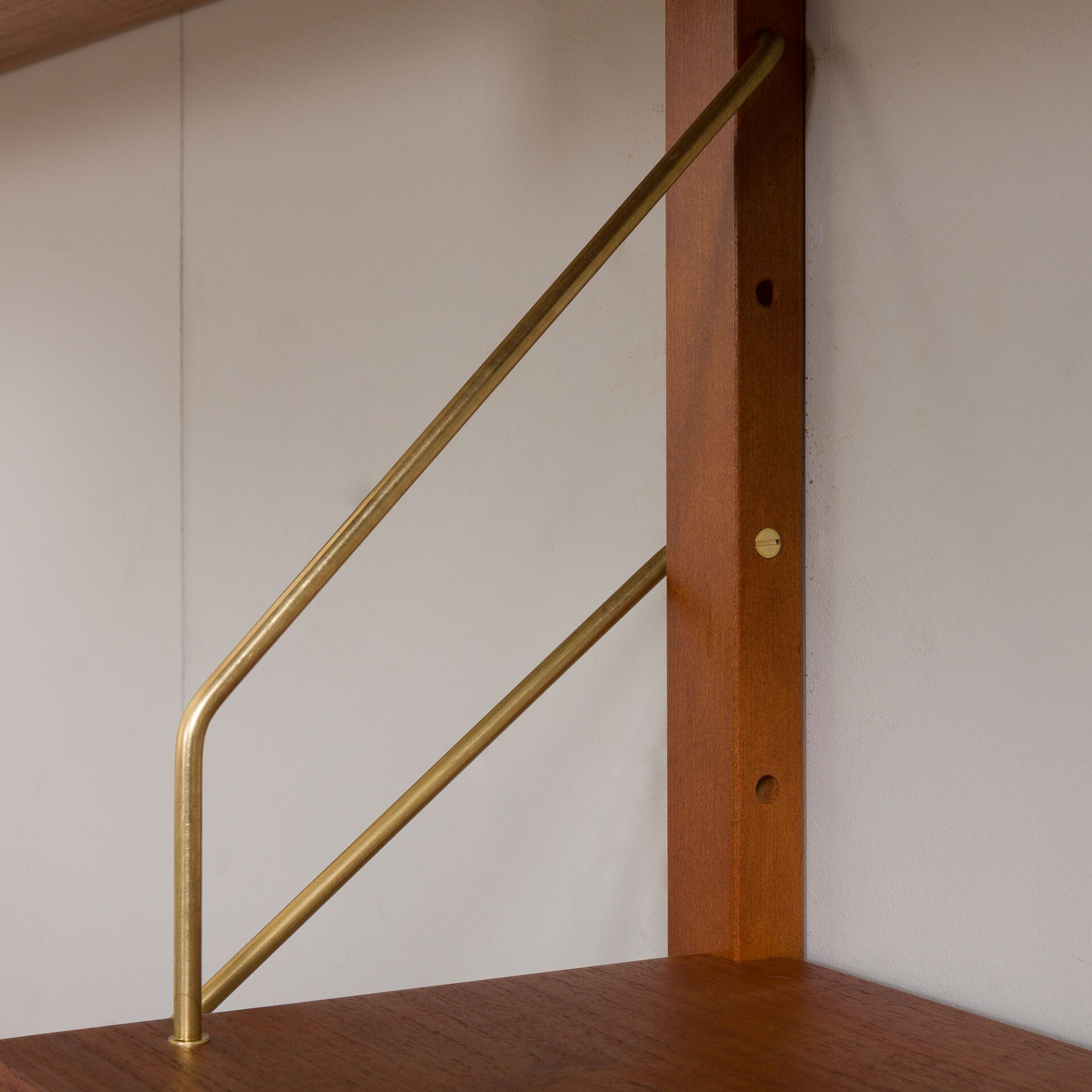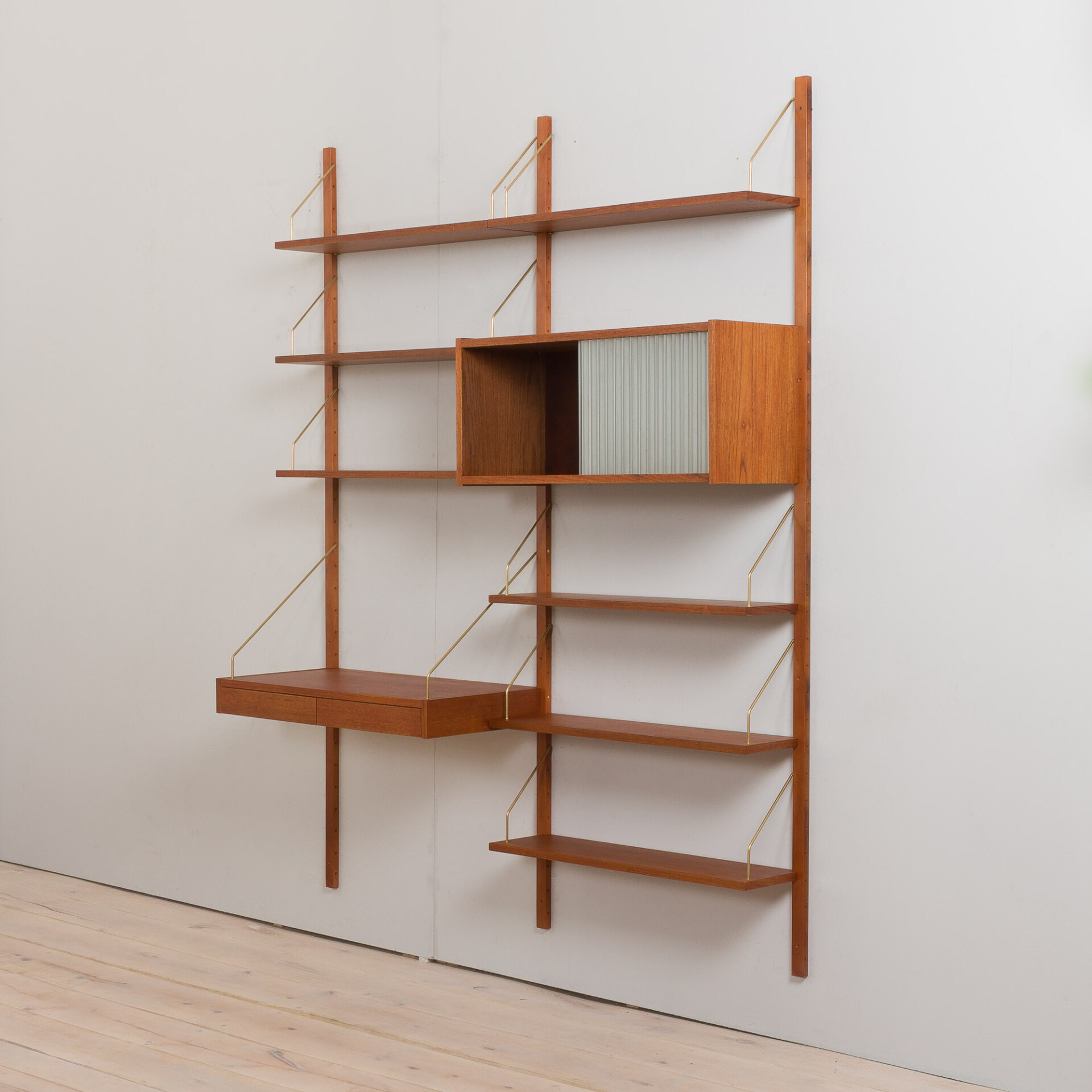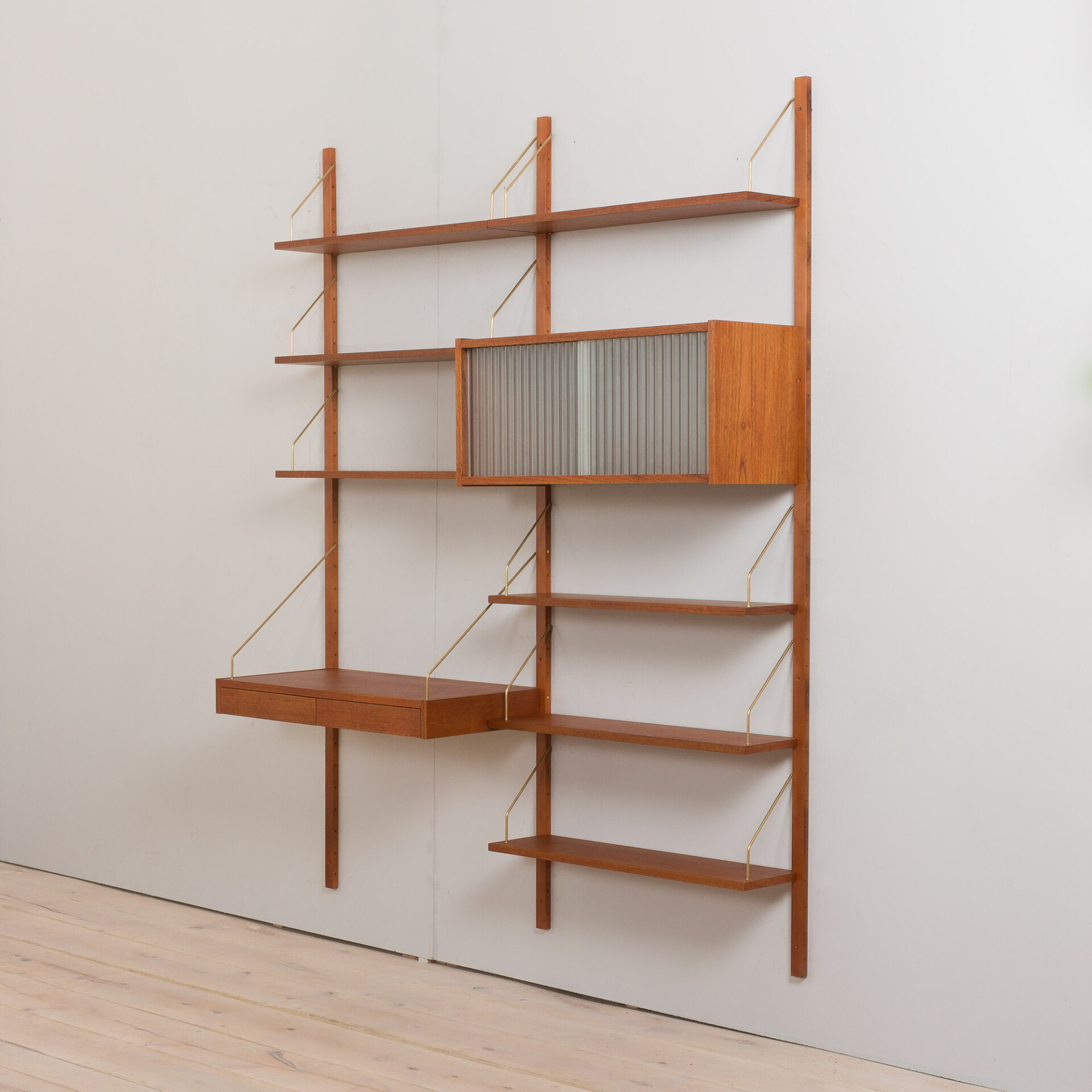Two-bay teak vintage bookcase with desk designed in the style of Poul Cadovius, Preben Sorensen manufactured in Denmark in the 1970 s. This entirely modular shelving system is ideal for a home office, as the compact desk will allow you to work even in the living room, or a bedroom. Each sections is 80cm wide and can be arranged at ones will. An additional element that makes class and elegance to the set is a shelf with fluted glass.