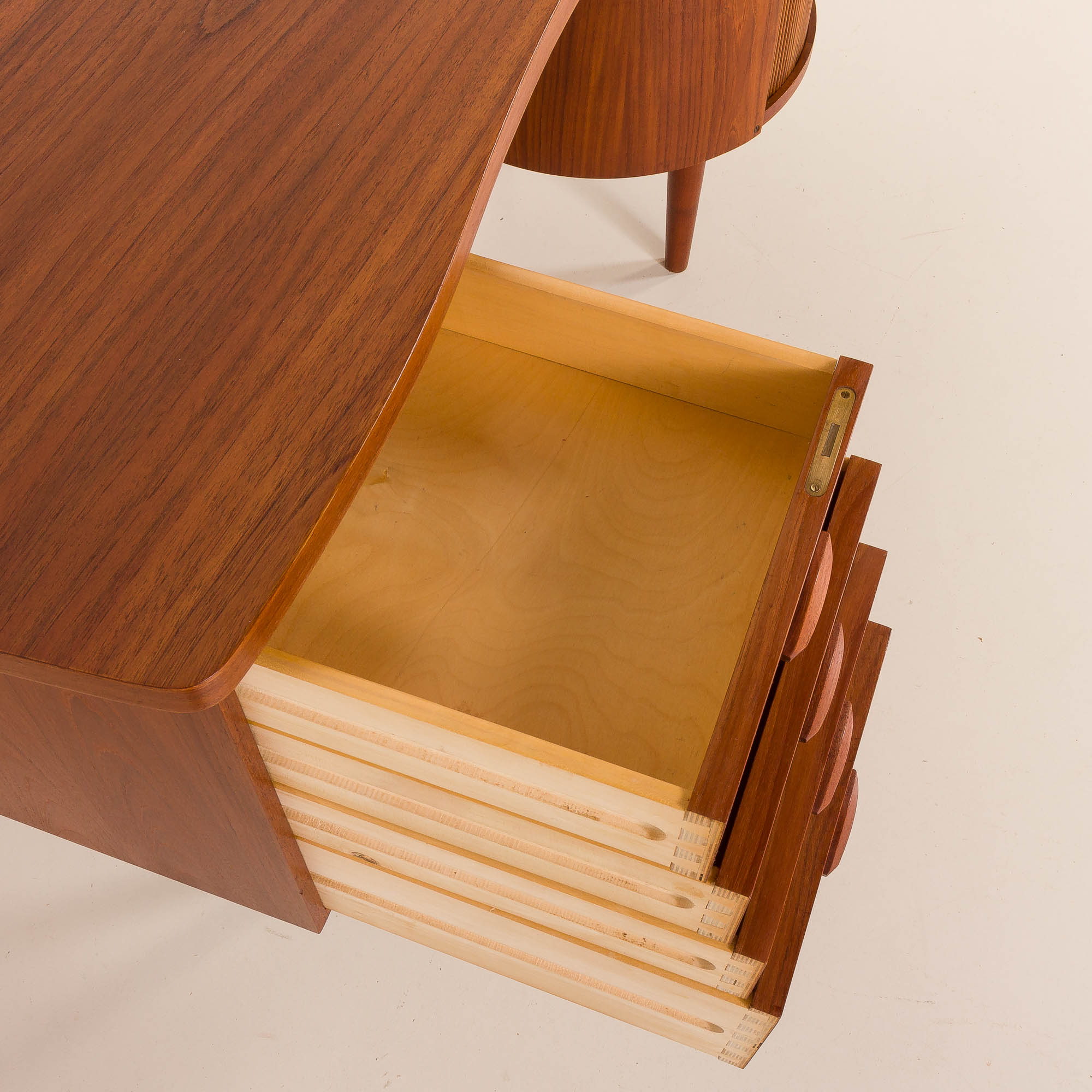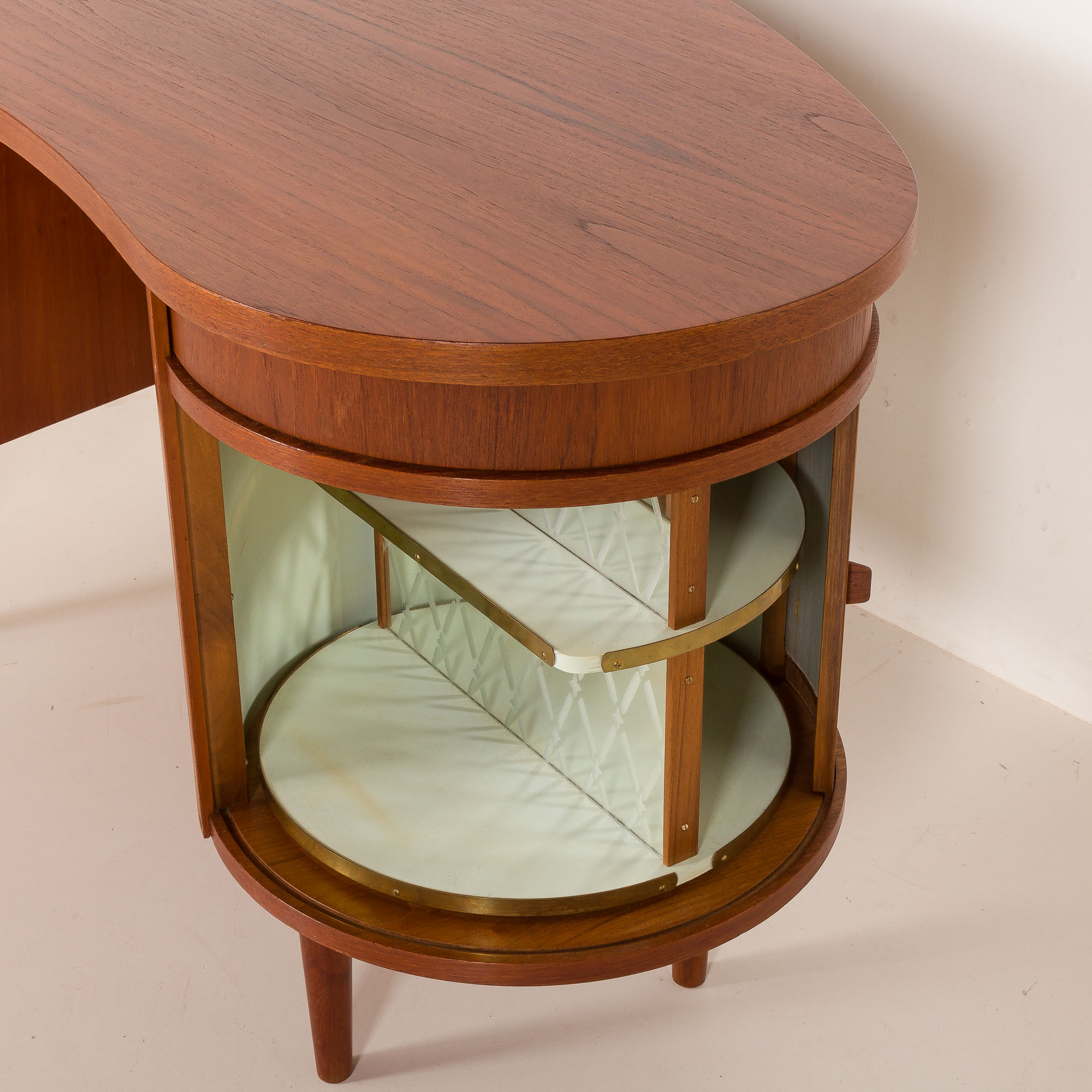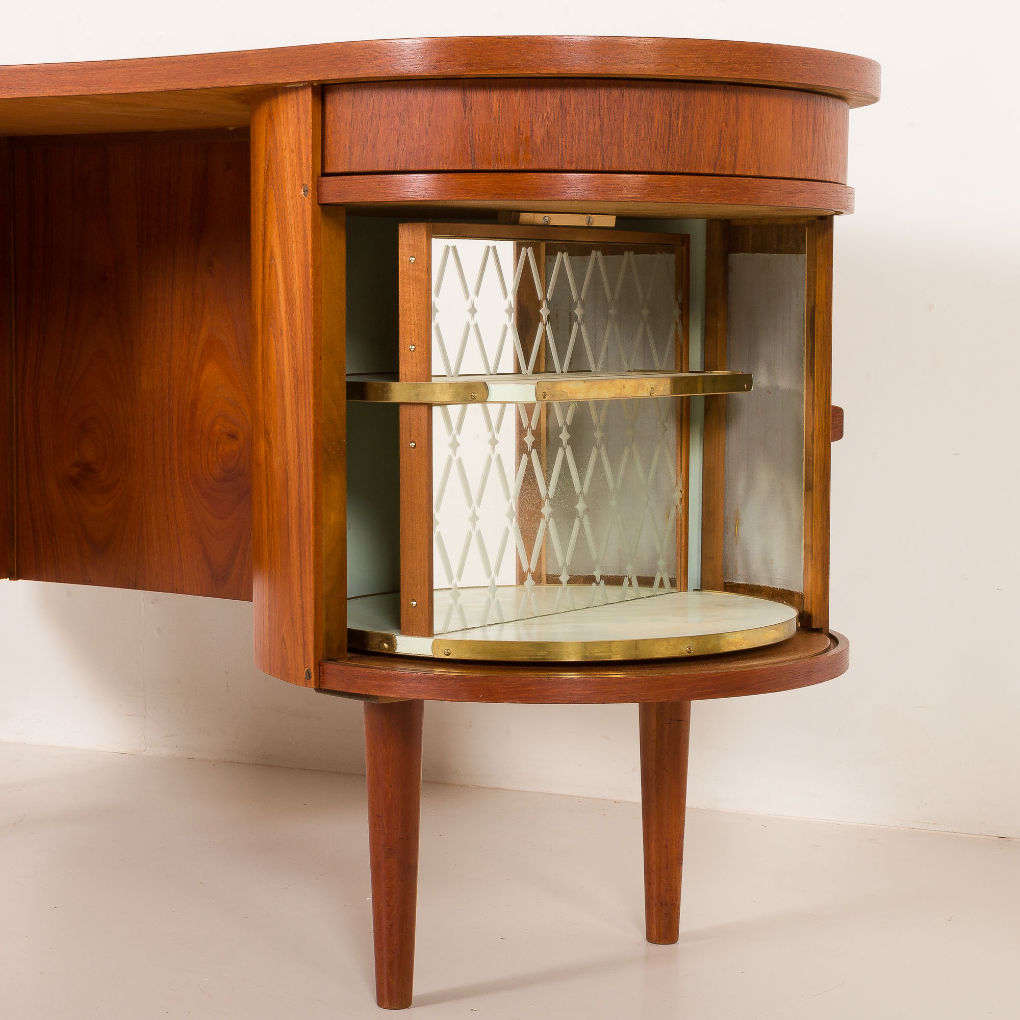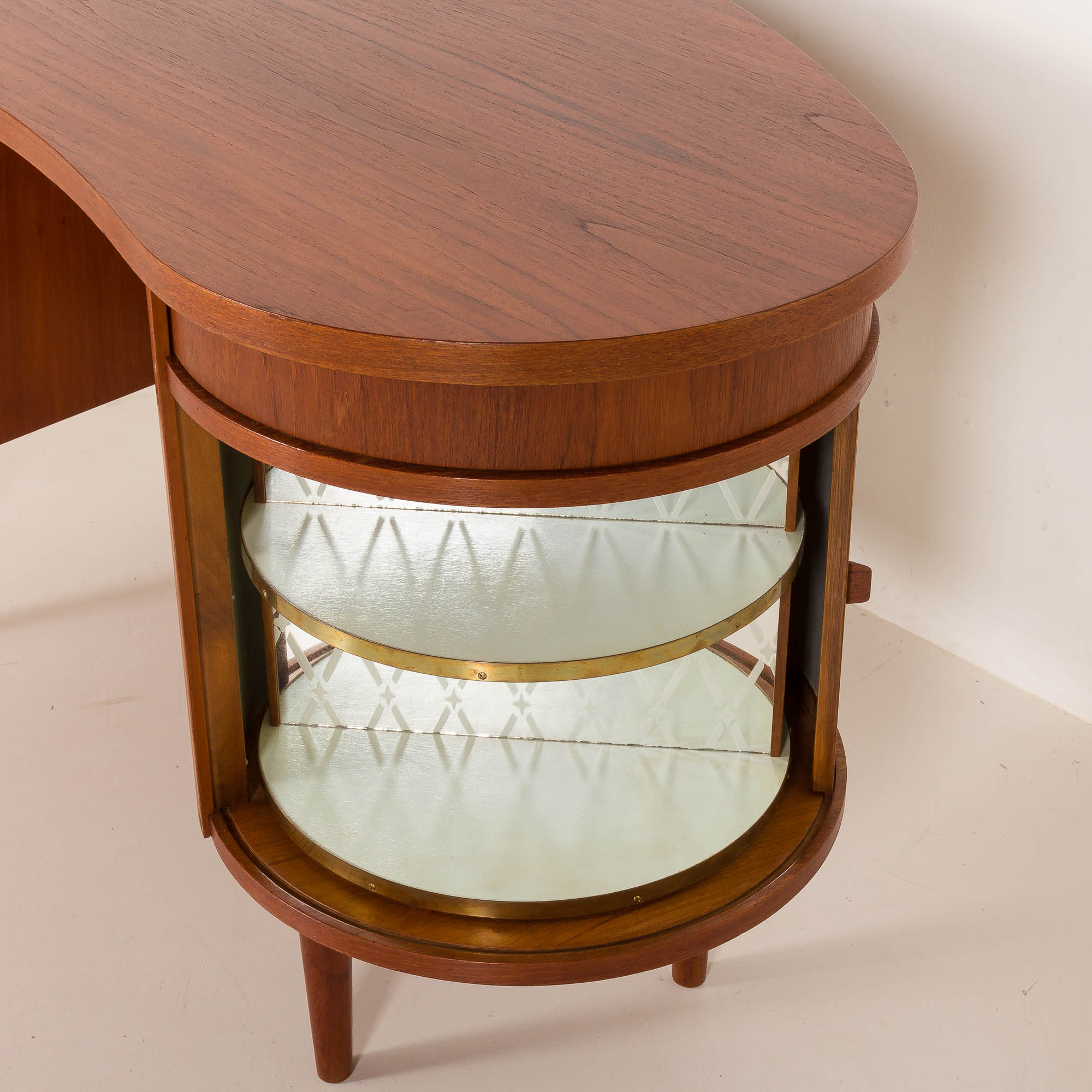 It is made of teak and features a remarkably shaped top with beautiful wood grain. A bar cabinet is hidden behind the tambour doors with pivoting shelves and etched mirrors, and a circular storage section for trinkets pulls out from under the desktop. This vintage desk also features four drawers in front, the top one lockable (key included), and open storage space at the back as two adjustable shelves useful for books and magazines. This absolutely magnificent piece represents mastery of Danish mid-century carpentry, evident in the beautifully grained wood and the precision of details. Legs are detachable for more convenient transport.