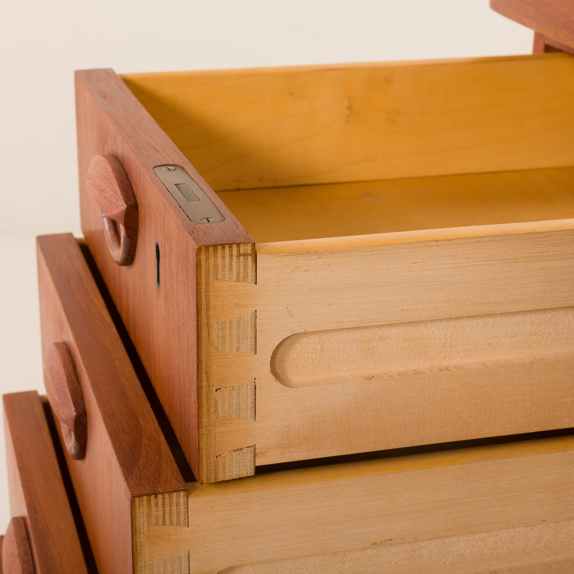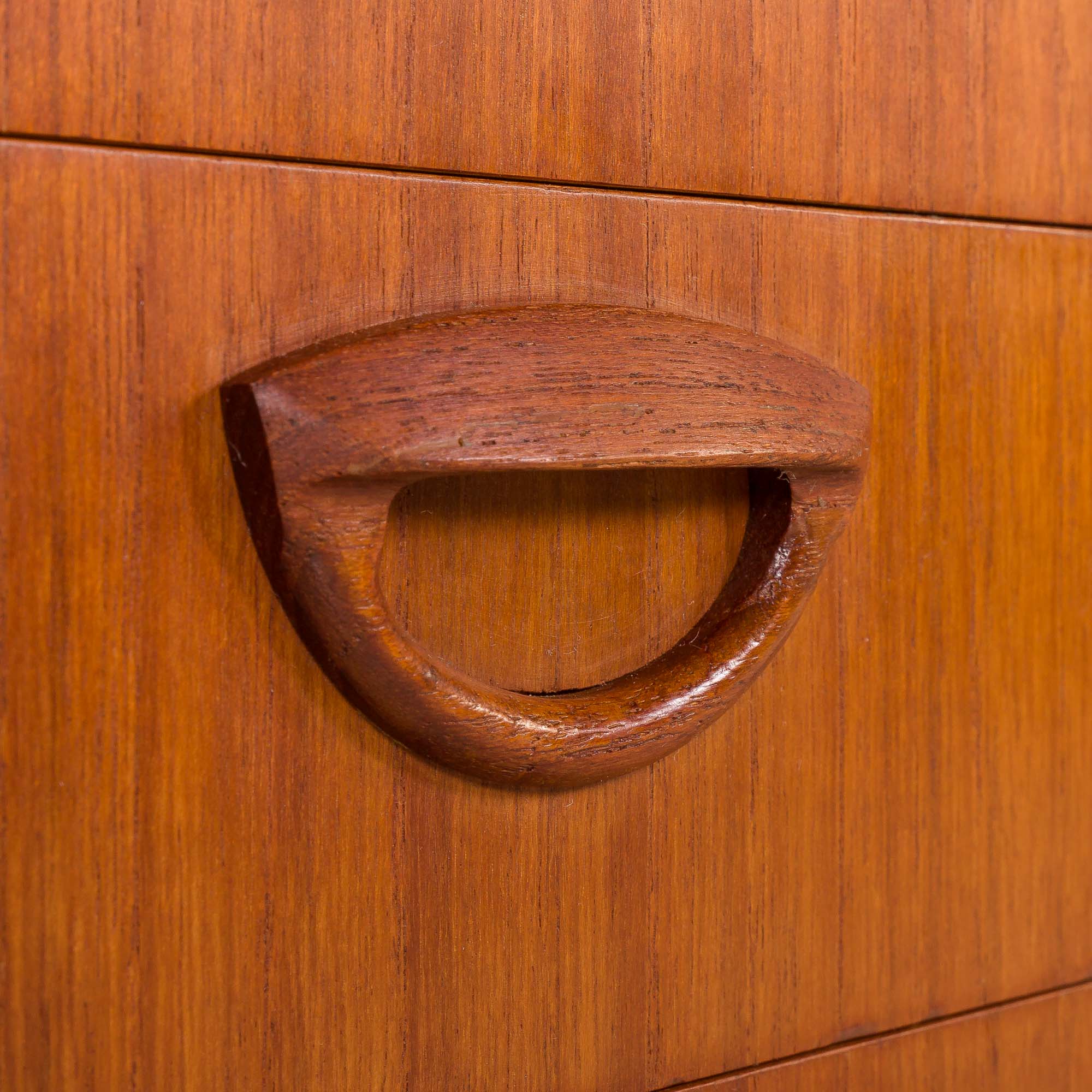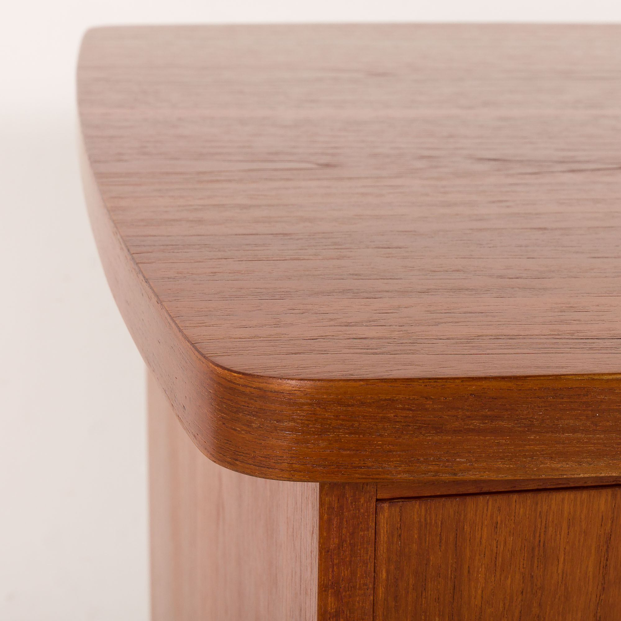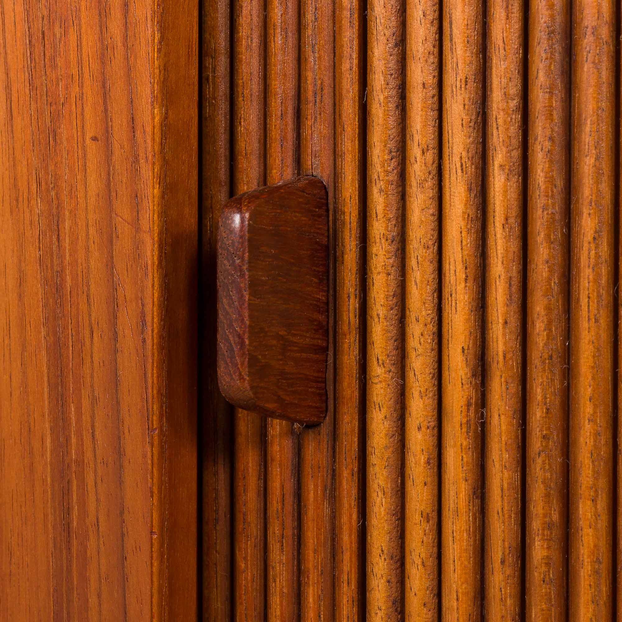 It is made of teak and features a remarkably shaped top with beautiful wood grain. A bar cabinet is hidden behind the tambour doors with pivoting shelves and etched mirrors, and a circular storage section for trinkets pulls out from under the desktop. This vintage desk also features four drawers in front, the top one lockable (key included), and open storage space at the back as two adjustable shelves useful for books and magazines. This absolutely magnificent piece represents mastery of Danish mid-century carpentry, evident in the beautifully grained wood and the precision of details. Legs are detachable for more convenient transport.