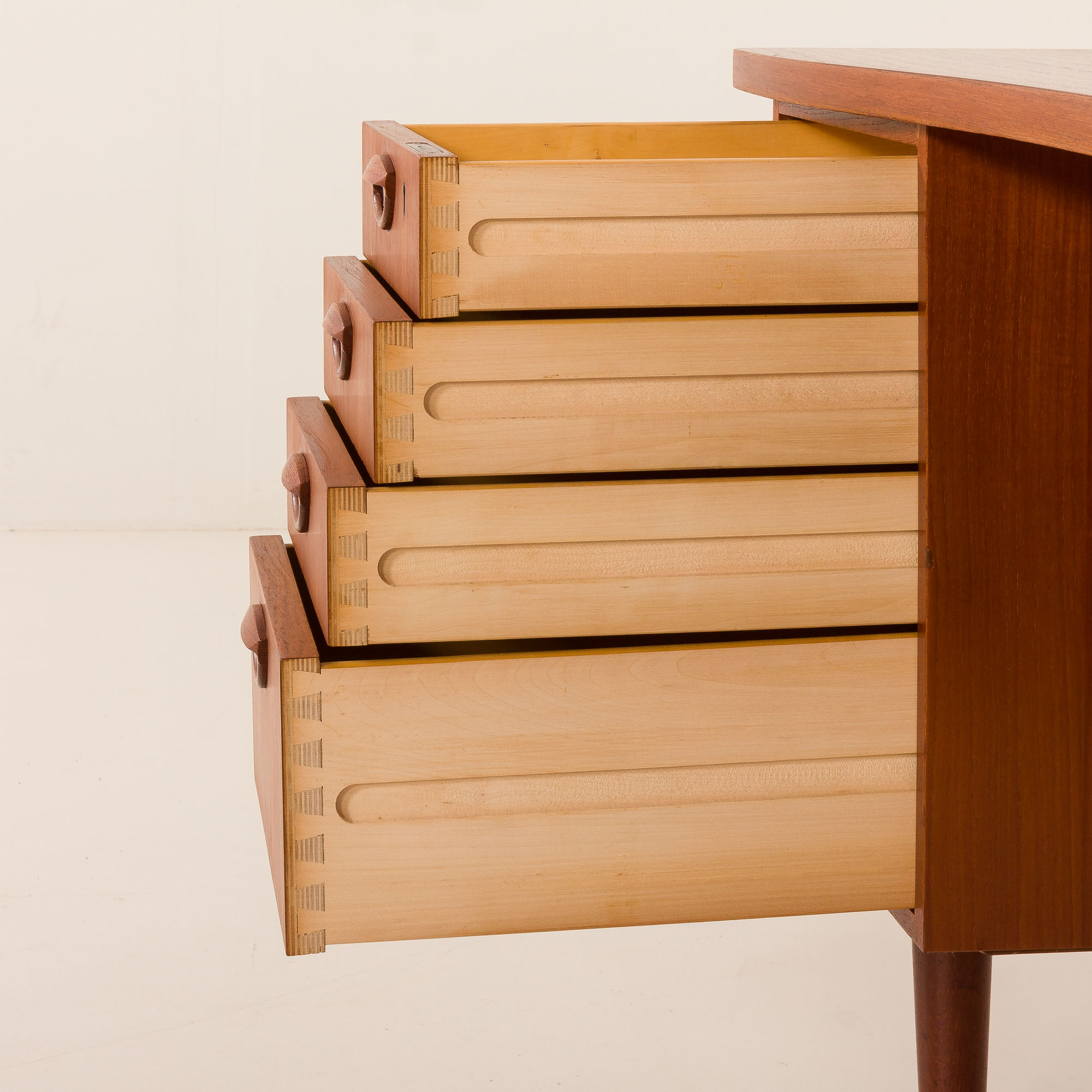This desk is well known as model 54, made by Feldballes Mobelfabrik and supposedly designed by Kai Kristiansen in the 1950s. It has been recently widely discussed whether Kai Kristiansen actually designed this particular desk; however, he was designing for a long time for Feldballes Mobelfabrik, and many gorgeous pieces, including desks, came from that cooperation. There is no confirmation whether it was his deign or not. No matter who actually drew it, it remains one of the most spectacular and representative pieces of Danish mid-century modern design.