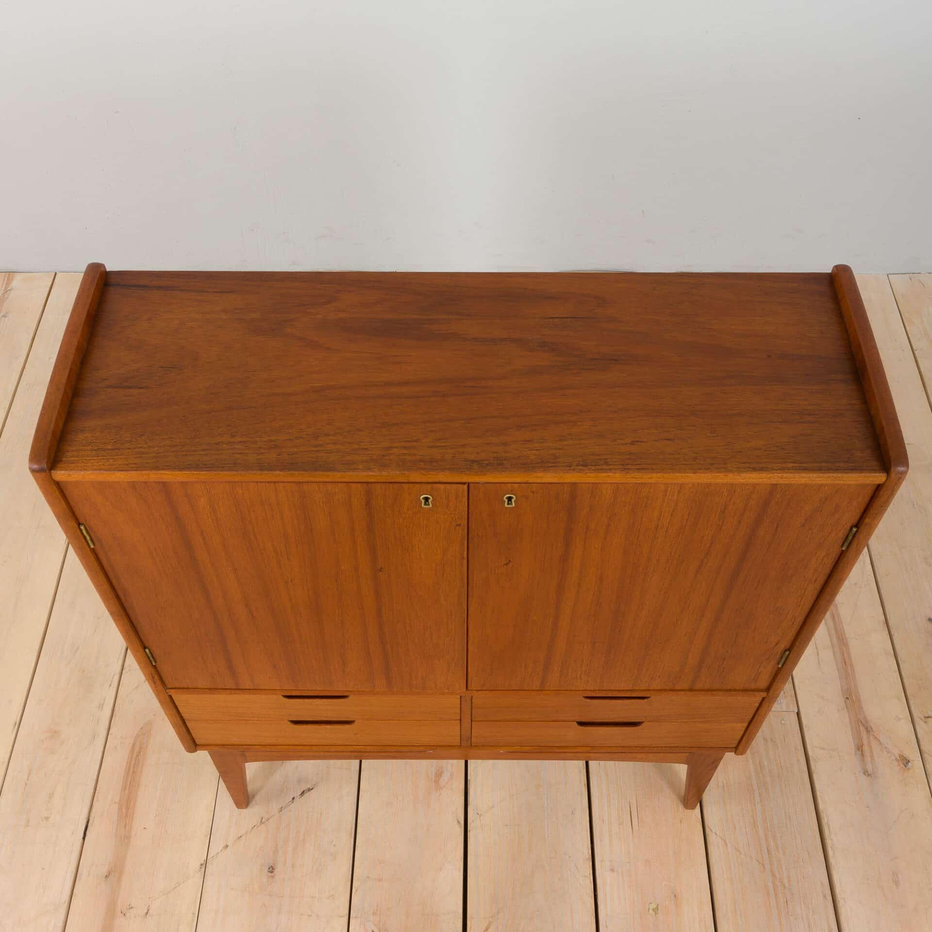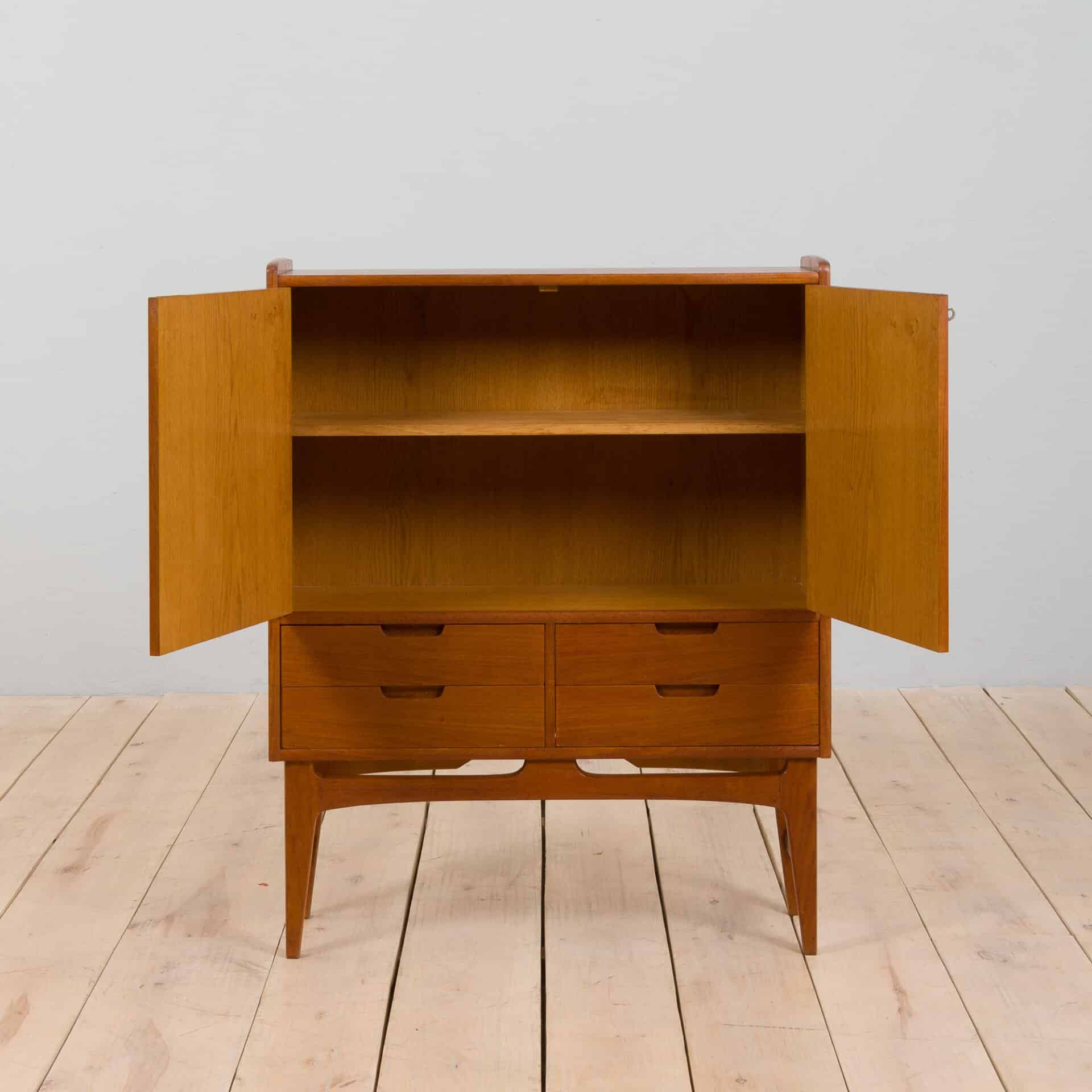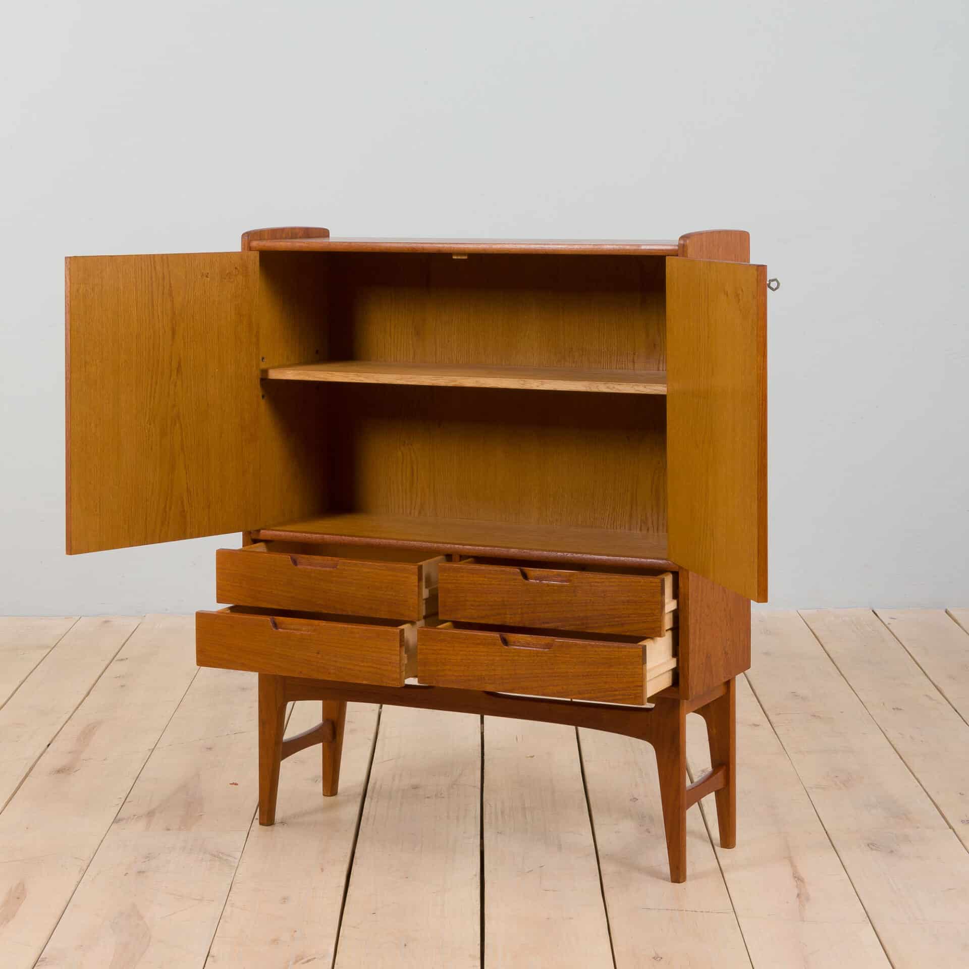 A neat and compact scandinavian teak dresser cabinet made in 60s. It features four drawers, lockable cabinet (original key included) and solid teak legs. The drawers are clean and work smoothly. Nice details in solid teak and subtle curves enhance the mid century look. The piece is in very good original condition with very minor traces of use, cleaned with professional compounds and recoated with Danish oil.