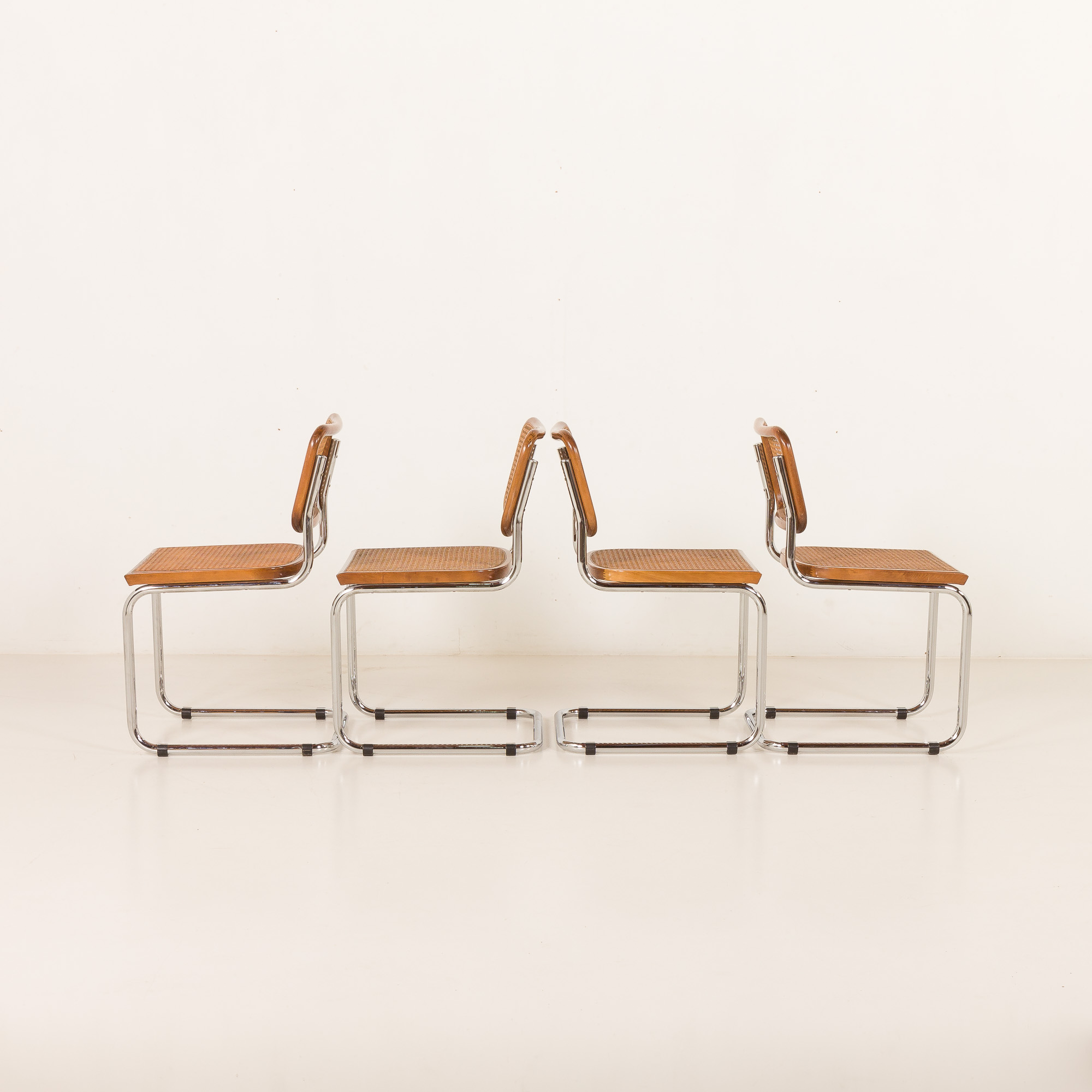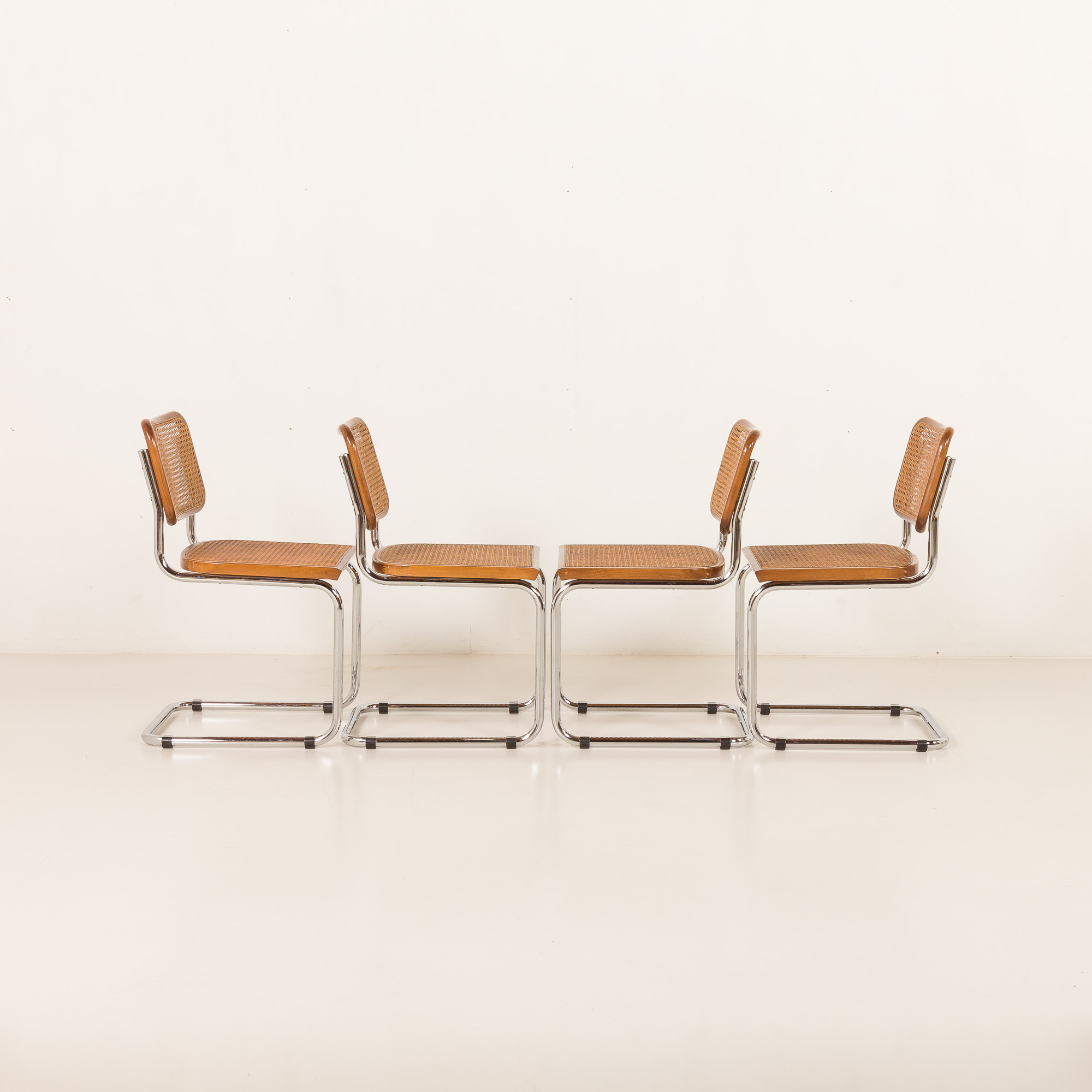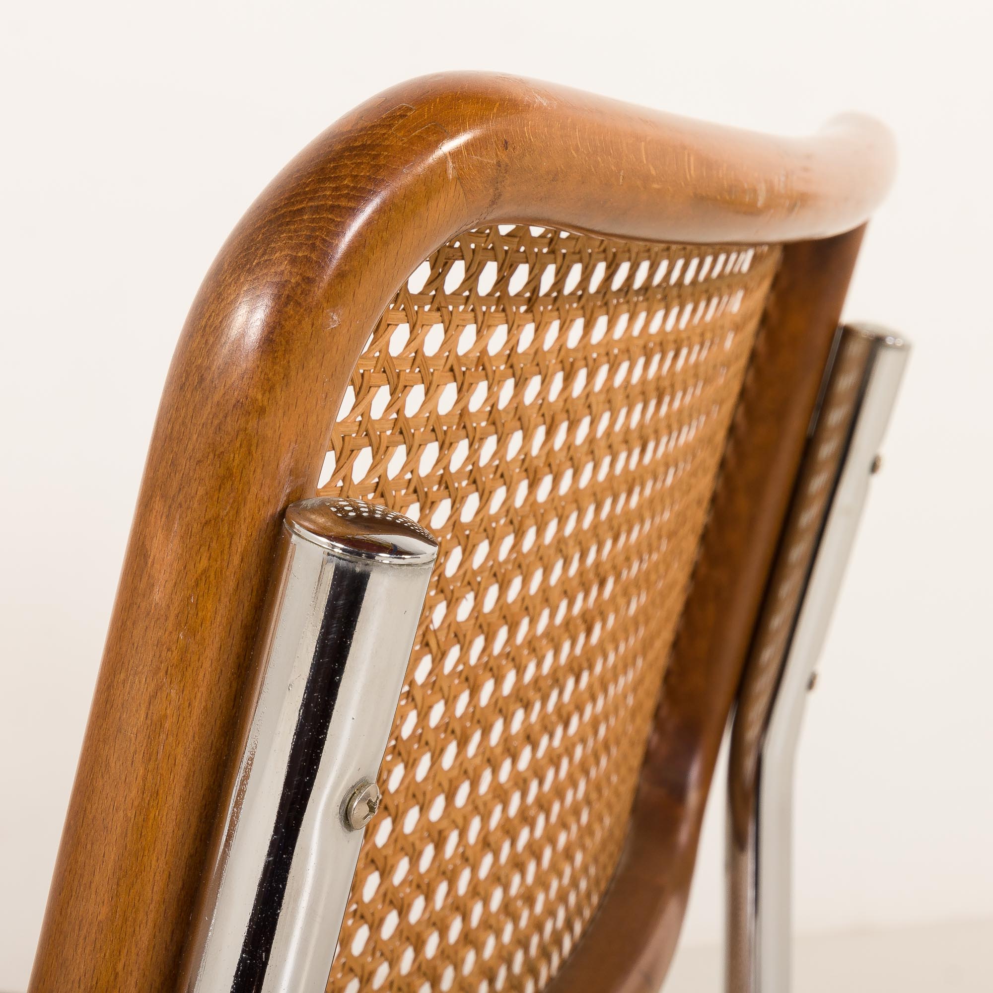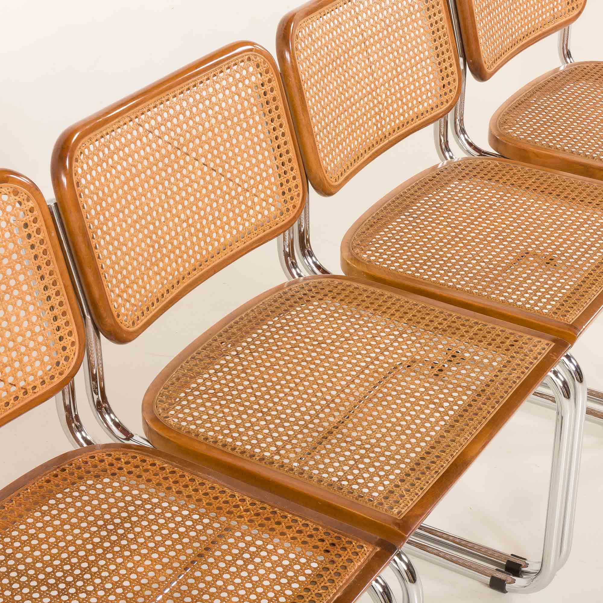 The world-renowned Cesca chair was designed in the 1920s by Marcel Breuer and manufactured by Thonet, Knoll, Gavina, and other companies. Throughout the 20th century, in Italy, there were numerous manufacturers, many of which were not licensed by Breuer. Some of the copies are very well done, though with good proportions, like the ones above.