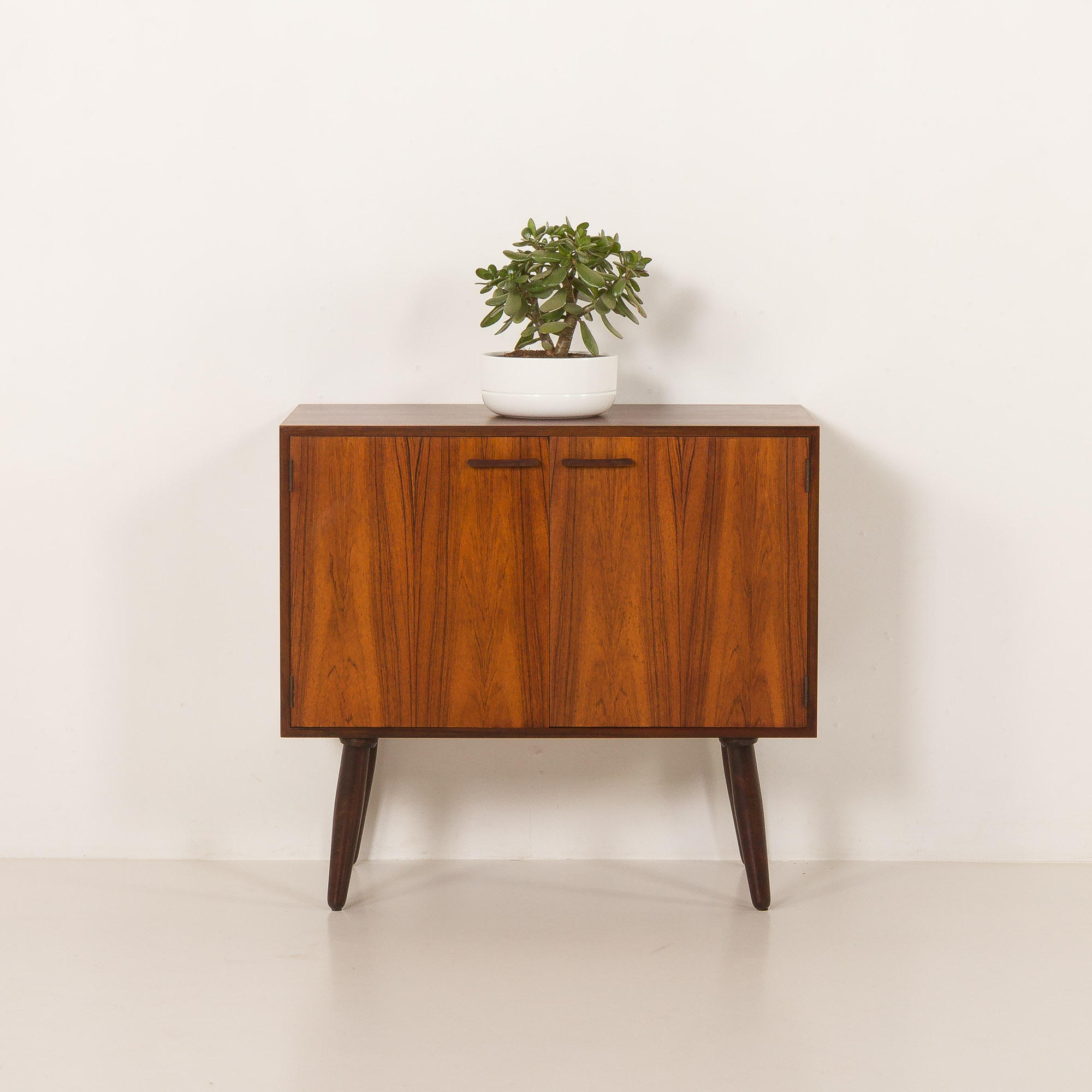 This cabinet shows mastery of Danish design – functionality, and beauty, visible in perfectly matched grains of rosewood veneer, or a sturdy tapered, detachable legs (which facilitate convenient transport). The interior has five compartments suitable for vinyl records, and a two drawers.
